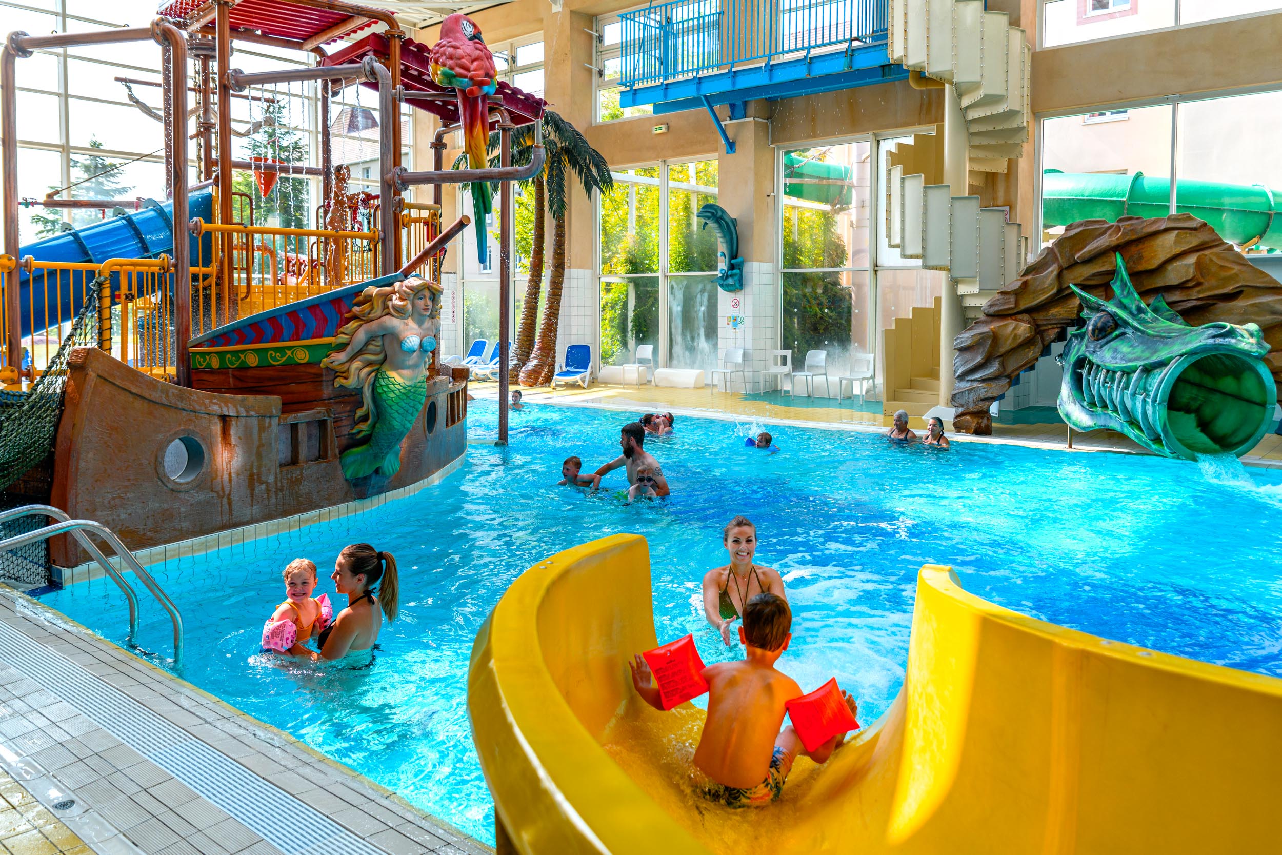Start your day with a buffet breakfast in the hotel’s Plantation Restaurant, offering pastries, breads, cereals, fresh fruit and a selection of hot and cold drinks. While evening meals are not included, you’ll have plenty of choice on-site, with options such as an international buffet, the cosy à la carte Captain’s Library, Marco’s Pizza for Italian favourites, sweet treats from Point Gourmand, and drinks in the Trader’s Bar. The hotel also features fantastic leisure facilities, including a water playground with swimming pool, slides and a pirate ship, Scally Wagg’s Jungle Adventure indoor play area, Sir Archibald’s Ship outdoor play area and a fun-filled games arcade.